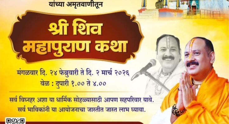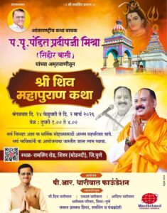 शिरूर (देवकीनंदन शेटे, संपदाक) : शिरूर जिल्हा पुणे येथे दिनांक २४ फेब्रुवारी २०२६ ते २ मार्च दरम्यान भव्य”श्री शिव महापुराण कथा” आयोजन करण्यात आले असून, या धार्मिक पर्वात हजारो शिवभक्तांनी सहभागी व्हावे असे आवाहन उद्योगपती प्रकाशभाऊ धारिवाल व युवा उद्योजक आदित्य धारिवाल यांनी पत्रकार परिषदेत सांगितले. श्री शिव महापुराण कथा कार्यक्रम हा उद्योगपती स्व.रसिकलाल धारिवाल नगरी रामलिंग रोड,शिरुर जिल्हा पुणे येथे मंगळवार दिनांक २४ फेब्रुवारी २०२६ ते सोमवार दिनांक २ मार्च २६ या कालावधीत दररोज दुपारी एक ते सायंकाळी ४ या वेळेत आयोजित करण्यात आला असून, कार्यक्रमाचे आयोजन पी. आर. धारिवाल फाउंडेशन चे उद्योगपती प्रकाशभाऊ धारिवाल व युवा उद्योजक आदित्य धारिवाल यांच्या वतीने करण्यात आले आहे. या पवित्र कथावाचनाचा शुभयोग आंतरराष्ट्रीय कथा वाचक प.पू. पंडित प्रदीपजी मिश्रा (सिहोर वासी) यांच्या अमृतवाणीतून लाभणार आहे. त्यांच्या ओजस्वी वाणीने शिवमहापुराणातील दिव्यप्रसंग, शिवतत्त्वज्ञान, भक्तीमार्ग, तसेच जीवनातील सकारात्मक परिवर्तन घडविणाऱ्या प्रेरणादायी कथा भक्तांना ऐकण्यास मिळणार आहेत. सदर कार्यक्रमाचे आयोजन रामलिंग रोड, शिरूर ग्रामीण येथे करण्यात आले आहे. या पवित्र कथेसाठी शिरूर परिसरातील तसेच पंचक्रोशीतील भाविक मोठ्या संख्येने उपस्थित रहावे असे आवाहन आयोजकांनी सर्व शिवभक्तांना केले आहे.