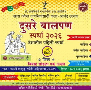 समाजशील न्यूज नेटवर्क,अहिल्यानगर : (प्रा.सुभाष शेटे,कार्यकारी संपादक) – ज्येष्ठ नागरिकांच्या कलागुणांना व्यासपीठ उपलब्ध करून देण्यासाठी डॉ. कांकरीयांचे मानकन्हैया ट्रस्ट यांच्या वतीने ‘दुसरे बालपण स्पर्धा २०२६’ या अनोख्या उपक्रमाचे आयोजन करण्यात आले आहे. देशातील पहिलीच अशी ही स्पर्धा असून यंदा तिचे तिसरे वर्ष साजरे होत आहे.या स्पर्धेचा मुख्य उद्देश ज्येष्ठ नागरिकांना त्यांच्या ‘दुसऱ्या बालपणात’ आनंद, सर्जनशीलता आणि आत्मविश्वास देणे हा आहे. ‘खास ज्येष्ठ नागरिकांसाठी कला-आनंद उत्सव’ या संकल्पनेतून हा उपक्रम राबविण्यात येत आहे.